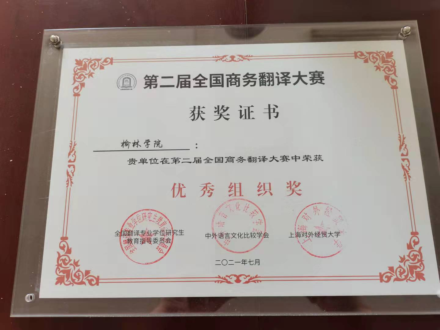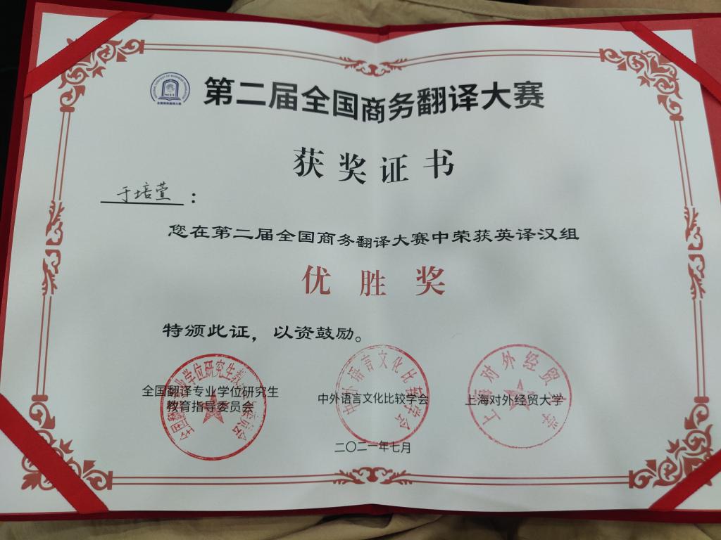 2021年第二届全国商务英语翻译大赛初赛暨太阳成集团tyc33455cc竞赛于5月15日在太阳成集团tyc33455cc成功举办。 此次商务英语翻译竞赛公司有共85名同学参加了比赛,荣获“优秀组织奖”。经过严格选拔,最终评选出1个一等奖,2个二等奖,3个三等奖,4个优秀奖。其中一等奖获得者于培萱同学入围决赛,受邀于7月18日去上海对外经贸大学参加决赛,最终获得优胜奖。