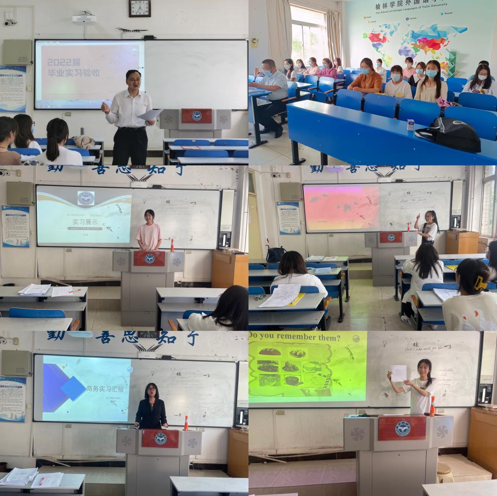 为检验自主实习成效,同时完成相关专业课程计划,2022年5月24日下午太阳成集团tyc33455在4206、4102、4308、4304四个教室分别对三个专业自主实习毕业生进行实习验收考核。为了巩固专业知识,提高实际操作技能,丰富社会经验,实现理论与实践相结合,太阳成集团tyc334552022届英语、商务英语、翻译专业毕业生进行了为期一个半月的专业实习。其中郭欢欢,汤玉凤,丁童等54名同学因与就业单位签订三方协议,选择自主实习。英语专业采用授课的方式,商务英语、翻译专业采用PPT展示的方式进行实习验收。