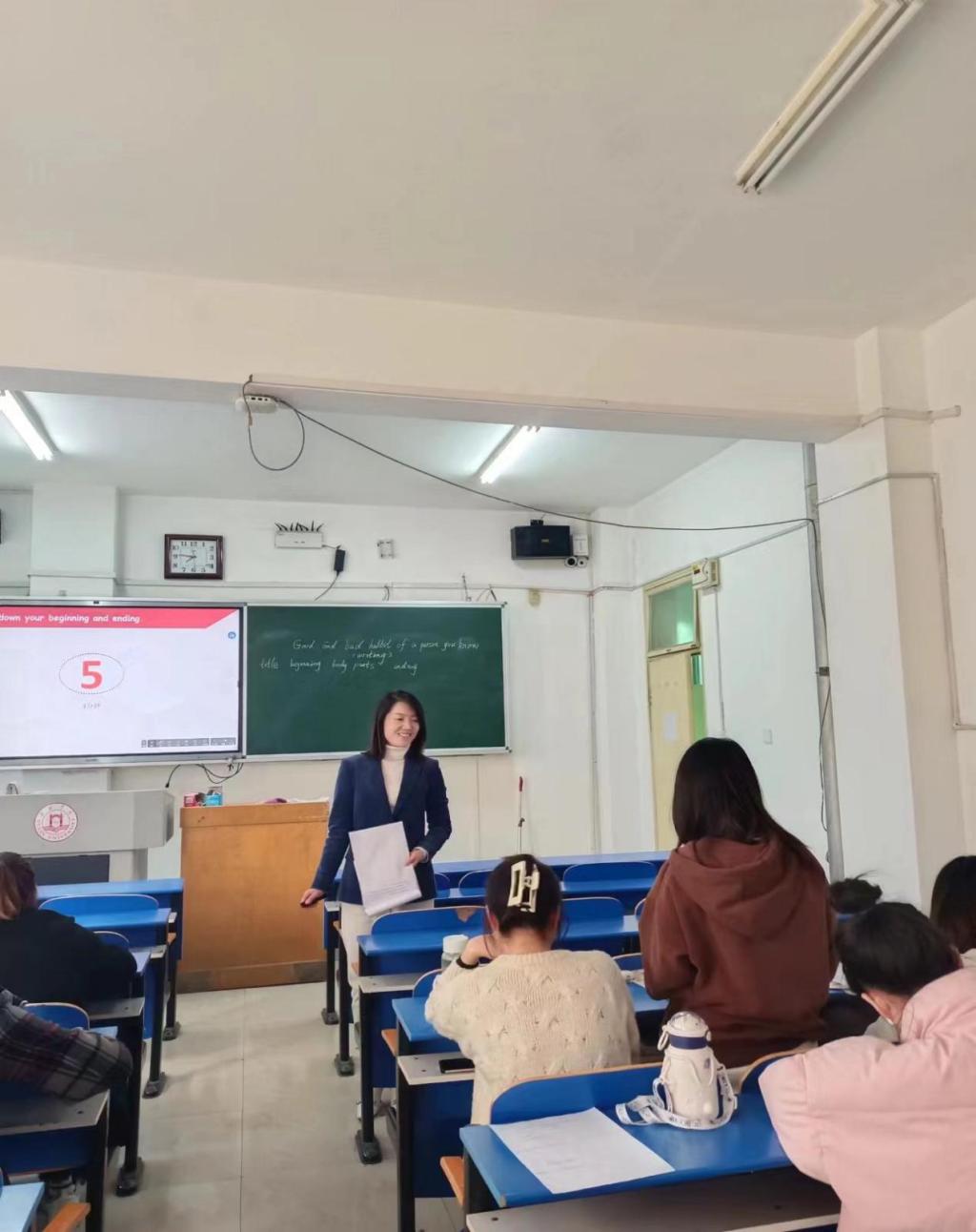 2022年10月18日下午,太阳成集团tyc33455特邀来自高新区教研室的省级教学能手高玉姣老师,为公司英语专业师范生进行了一场生动的英语写作示范课。该示范课是《未来教师训练营》其中的一个教学模块。结合当今课改前沿新理念、新思路、现代教育技术、好的教学方法和教学技巧,高玉姣老师就如何上好一堂英语写作课对员工进行了示范和指导。