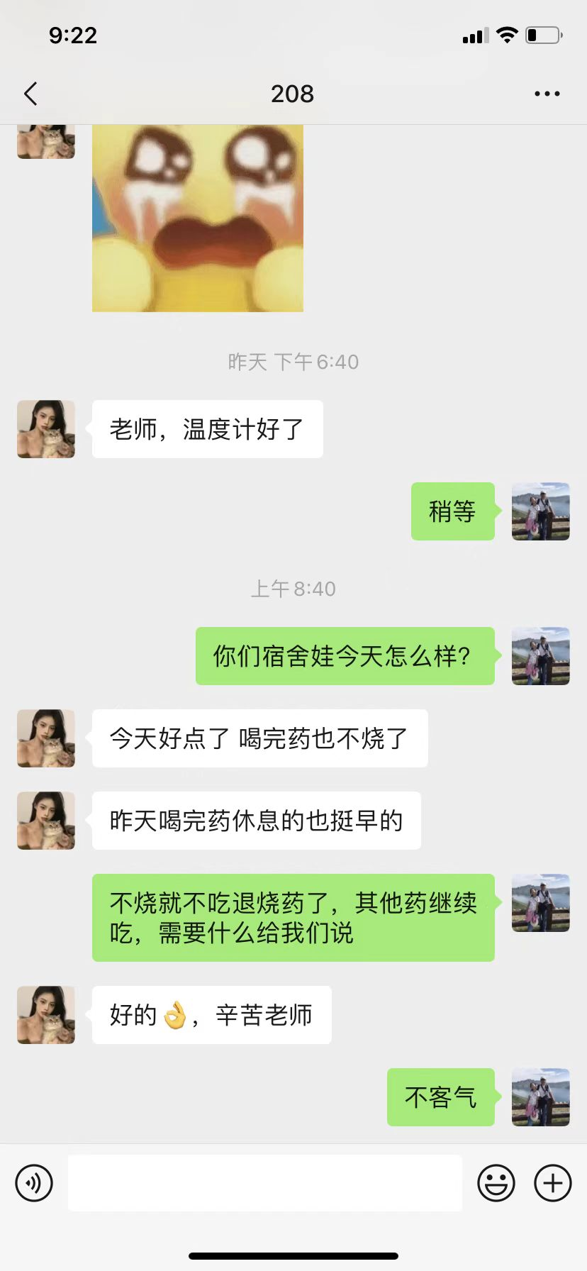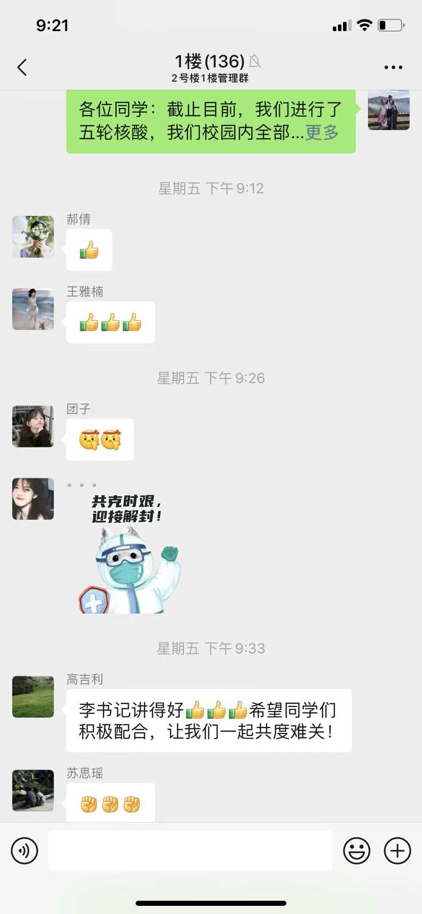 在学校启动预案、进行动员的第一时间,公司领导、老师积极参与投入楼长、层长工作,入驻宿舍与同学们朝夕相处,一同克服各类困难:半夜敲门提醒全体同学起床,科学组织全员核酸;在微信群里给员工分析形势、解释政策,排解压力;将学校为大家发的爱心水果挨个送到宿舍,及时上门补充口罩;联系医务室处理员工感冒发烧,外出将住院员工接回。几日的相处,师生们彼此信赖、相互支持。