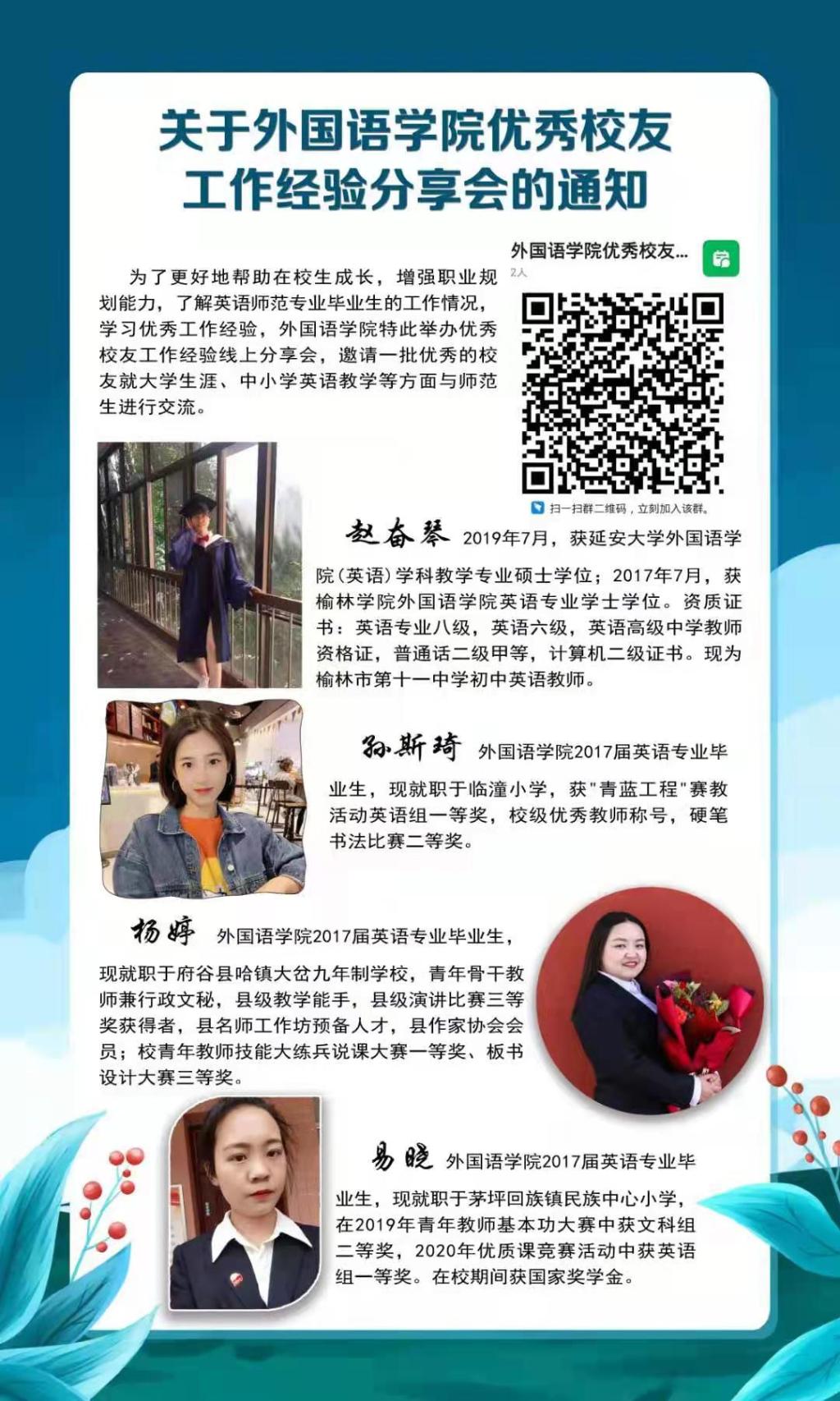 为进一步加强创新创业教育工作,帮助在校老员工增强职业规划能力,激励广大在校生努力学习,立志成才,2021年6月4日晚7点,太阳成集团tyc33455优秀员工工作经验分享会在钉钉群线上上直播进行。太阳成集团tyc334552017届优秀毕业生赵奋琴、孙斯琦、杨婷和易晓,应邀为公司员工做了分享会,交流工作经验,畅谈人生感悟。分享会由公司党总支秘书高燕鹏主持,太阳成集团tyc33455全体英语专业师范生聆听了优秀员工的分享会。