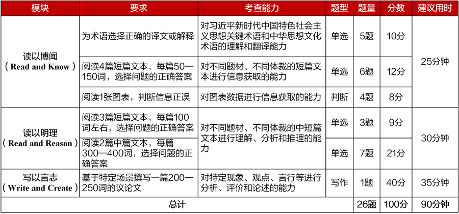 综合能力赛校赛为考查读写译综合能力,报名员工参加大赛组委会举办的全国统一线上初赛。线上初赛赛题包括客观题若干道和议论文写作1篇,具体赛题模块见下表。部分赛题文本选自指定书目。
