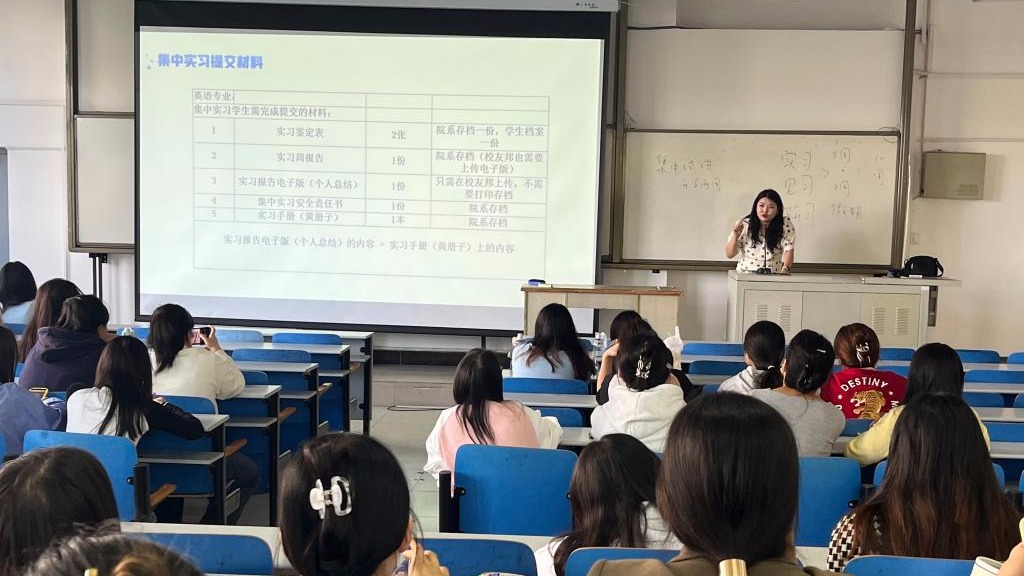 此外,刘晓宁老师还强调实习期间的要求和注意事项。第一,要严格遵守实习学校的规章制度。包括考勤制度、着装要求、言行举止规范等。大家代表着我们的学校和专业,要以良好的形象和专业的态度展现我们老员工的风采。第二,要虚心向指导教师学习。实习学校的指导教师们有着丰富的教学经验和专业知识,他们是大家实习期间最好的导师。大家要积极主动地向他们请教,认真听取他们的意见和建议,不断改进自己的教学。第三,要关爱员工,尊重员工的个性和差异。每一个员工都是独一无二的,大家要以爱心和耐心去关心他们的学习和生活,激发他们的学习兴趣和潜力。同时,要注意保护员工的隐私和权益,建立良好的师生关系。第四,要注意安全。无论是在校园内还是在外出参加教学活动时,都要时刻保持安全意识,确保自己和员工的人身安全。大会最后,封仪璠老师详细介绍了实习的流程、并对实习期间提交的全部材料进行了一一说明。