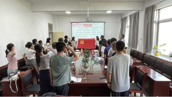 重温誓词,凝聚奋斗力量:在庄严的氛围中,全体党员面向党旗,高举右拳,重温入党誓词。铿锵有力的誓言在会场回荡,提醒着每一位党员时刻铭记入党时的庄严承诺,激励大家永葆政治本色,坚定理想信念,将铮铮誓言转化为立足岗位、担当作为、服务师生的强大精神动力。