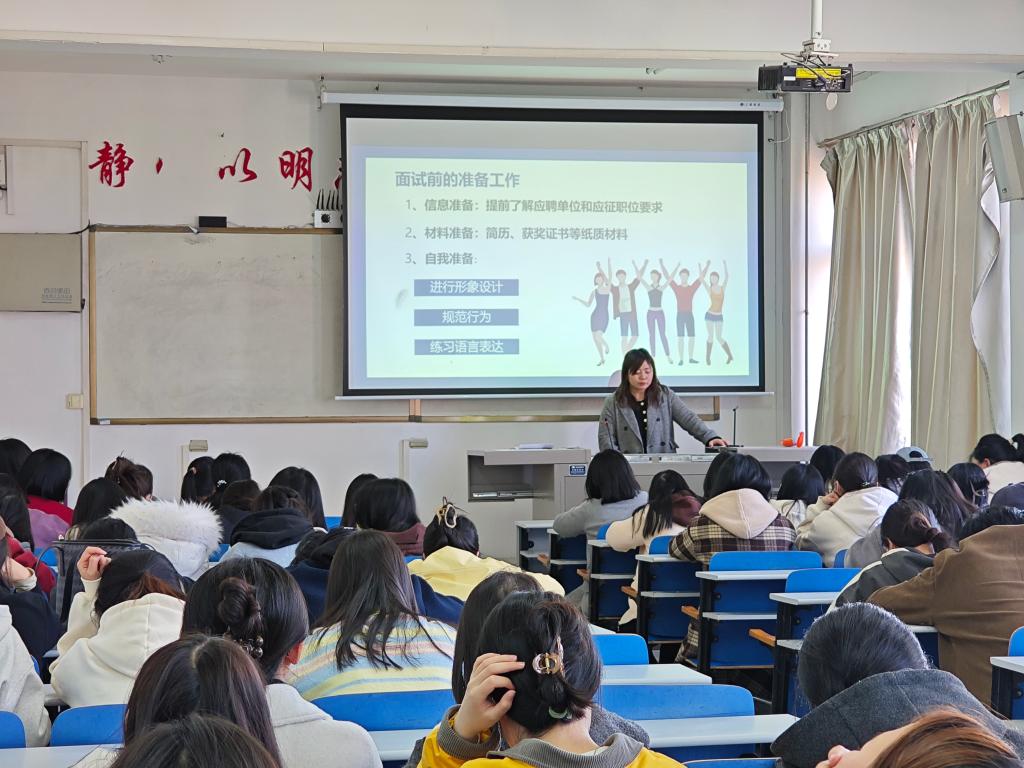 党总支副书记苏毅围绕国家促就业政策和学校就业支持体系展开宣讲。重点介绍学校“访企拓岗促就业”专项行动成果。针对毕业生关注的“应届生身份认定”“三方协议签订规范”等热点问题,帮助毕业生明晰政策边界,用好用足就业资源。
